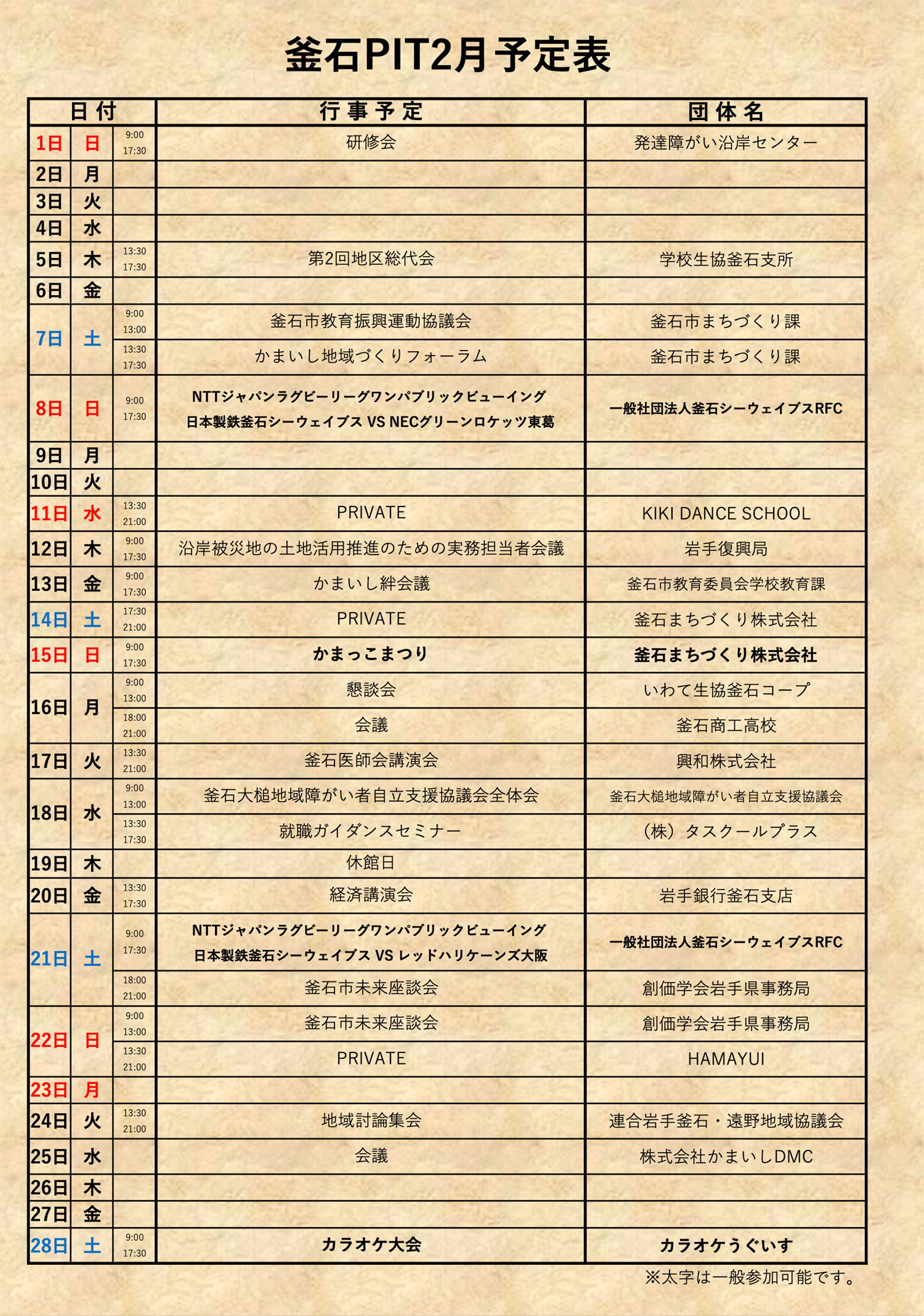 釜石PIT 2026年2月のスケジュール 2026/02/02地域情報 #pit FACEBOOK Twitter LINE 太字で表示されているイベントは一般の方も参加できます。イベントに関するお問い合わせは、各主催者までお願いいたします。 施設に関する詳細はこちらのページをご覧ください。 釜石まちづくり株式会社 釜石まちづくり株式会社(愛称 フェリアス釜石)による投稿記事です。 問い合わせ:0193-22-3607〒026-0024 岩手県釜石市大町1-1-10 釜石情報交流センター内 公式サイト